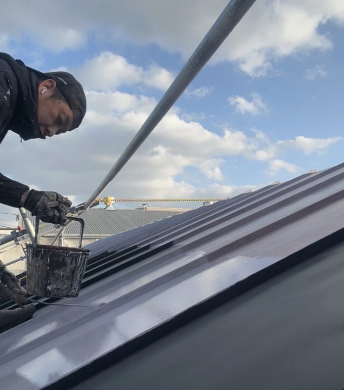 屋根は、上塗りがスズカファインのビーズルーフ、下塗りは1液ワイドさびストップ グレーです。